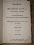 Handbuch der operativen Medicin, chirurgischen Anatomie und Instrumentenlehre. Mit 112 nach der Natur gezeichneten Tafeln. Nach dem Französischen frei bearbeitet von Dürr. Erster Band sep. Schwäb. Hall und Leipzig, Nitzschke, ohne Jahr (1853). Zweite Auflage. Kl.-8°. Neuerer, einfacher Halblederband. Namensstempel auf dem Vorsatz. 302 Seiten, 44 (zzgl. 43 b) Tafeln mit Illustrationen zu Operationen und III Instrumententafeln (so der 1.Band komplett). Durchgehend etwas braunfleckig, anfangs stärker. Untere Außenecke mit altem Feuchtrand, auch die Tafeln und teils stärker betroffen. Mäßig erhaltenes Exemplar. |