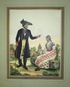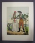 Maehrische Volkstrachten. Hradischer Kreis. Herrschaft Bisenz, Ehepaar. Eiweißgehöhte altkolorierte Lithographie von Wilhelm Horn aus: Maehrische Volkstrachten. Maehrens ausgezeichnete Volkstrachten. Brünn, Rohrer, 1837. Ca. 29,5 cm x 22,5 cm Seltenes Blatt aus der Sammlung von Kostümtafeln der verschiedenen Regionen Mährens von dem Lithografen Wilhelm Horn (1809 - 1891), gedruckt von Johann Höfelich. Nur zwei komplette Exemplare dieses Werkes sind bekannt, eines davon in der Kunstbibliothek der Staatlichen Museen zu Berlin, das andere in der Morgan Library in New York. - Unter Passepartout montiert. Bis zum Bildrand beschnitten und auf Karton mit getuschtem Rand und Goldzierleisten montiert. Der ausgeschnittene Originaltitel fehlt. Minimal braunfleckig.