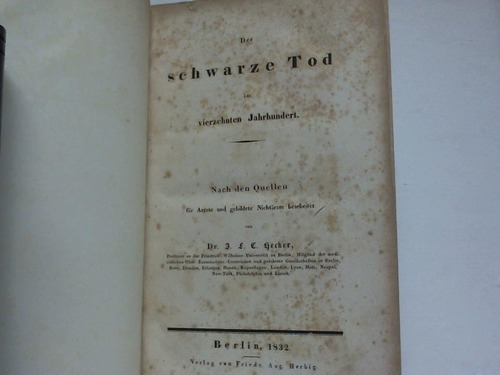 Der schwarze Tod im vierzehnten Jahrhundert. Nach den Quellen für Aerzte und gebildete Nichtaerzte bearbeitet Bln., Erste Ausgabe. Herbig, 1832. VI/102 S., orig. Halbleinen. (durchgehend etwas stockfl./Titel stärker fleckig.)---- Justus Friedrich Carl Hecker (1795-1850), Professor für Medizin-Geschichte in Berlin. Der schwarze Tod war neben ''Geschichte der Heilkund'' eines seiner Hauptwerke. Engelmann, Bibliotheca Medico..., S. 231 -.