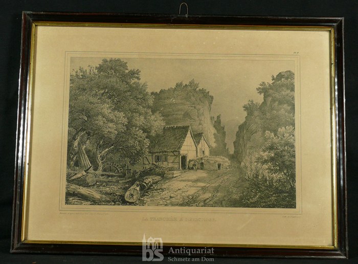 La Tranchée a Meyschoss. Lithographie von Engelmann nach N. Ponsart [dat.] 1831. _. 21,5 x 29,5 cm. Gerahmt, Holzleiste (30,5 x 41 cm). Leicht gebräunt, Leiste mit kl. Gebrauchsspuren, Leistenvergoldung stellenweise oxydiert. Gerahmt (30.5 x 40.5), Holzleiste mit kl. Gebrauchsspuren. - Oberh. re. bez. 'Pl. 7'. (Tafel 7 aus 'Souvenirs de la Prusse rhénane'). Unterhalb: ' Dessiné d'après nature et lith[ographi]é par N. Ponsart 1831. - Lith[ographie] de Engelmann'. Kunstdenkmäler Ahrweiler 406.3. - Das Blatt zeigt den Durchbruch bei Mayschoss mit der Lochmühle. - Abbildung S. 72 bei Poppelreuter/van Rey und Abb. 33 bei Czerannowski.