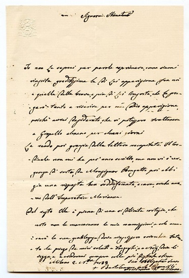 Eigenh. Brief mit U. Mailand, 2. XI. 1853. 1 S. auf Doppelblatt. 8vo. Interessanter Brief an einen hochrangigen österreichischen Beamten womöglich in Zusammenhang mit dem am 18. August 1855 abgeschlossenen 1. Konkordat. Romilli dankt dem Empfänger und seiner Frau enthusiastisch, die er gerne länger in Gropello Cairoli bei Mailand als Gast gehabt hätte. Er berichtet, dass ein nicht namentlich erwähnter Kardinal noch nicht geschrieben hat, die "sehr zufriedenstellende" Antwort von Monsignore Luigi Bragato, dem Beichtvater der österreichischen Kaiserin, "sogar im Namen der Kaiserin Maria Anna selbst", jedoch bereits vorliege. Schließlich bittet Romilli den Empfänger Grüße an zwei Beamte auszurichten. Der Brief im italienischen Original: "Io non le saprei per parole esprimere, come siami riuscita graditissima la di Lei apparizione fra noi e quella della brava e pia di Lei consorte che La pregherò tanto a riverire per me. Dico apparizione, poiché avrei desiderato, che si potessero trattenere a Gropello almeno per alcuni giorni. Le rendo poi grazie delle lettere recapitate. Il Cardinale non mi ha per'anco scritto, ma non vi è urgenza di sorta, da Monsignore Bragatto poi ebbi già una risposta ben soddisfacente, e cara, anche a nome dell'imperatrice Marianna. Del resto Ella è piena di una si delicata cortesia, che certo non le mancaranno le mie commissioni, e solo accuserà la sua gentilezza dove le riuscissero soverchie. Intanto la prego de' miei saluti a Tusoghi e a Noy [...]". - Auf Briefpapier mit geprägtem Wappen.