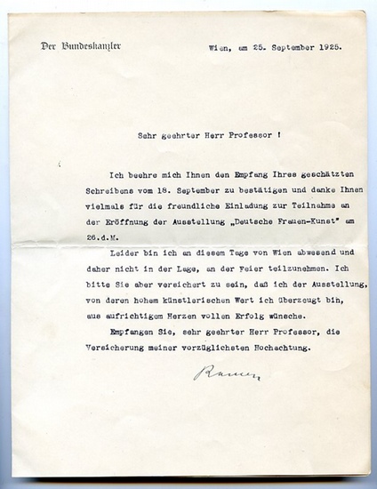 Ms. Brief mit U. ("Renner"). Wien, 25. IX. 1925. 1 S. auf Doppelblatt. 4to. An einen namentlich nicht genannten Professor mit Dank für "die freundliche Einladung zur Teilnahme an der Eröffnung der Ausstellung 'Deutsche Frauen-Kunst' am 26. d. M.": "Leider bin ich an diesem Tage von Wien abwesend und daher nicht in der Lage, an der Feier teilzunehmen. Ich bitte Sie aber versichert zu sein, daß ich der Ausstellung, von deren hohem künstlerischen Wert ich überzeugt bin, aus aufrichtigem Herzen vollen Erfolg wünsche [...]". - Auf Briefpapier mit gedr. Briefkopf "Der Bundeskanzler".