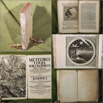 Meteorologia Philosophico - Politica, in duodecim dissertationes per quaestiones meteorologicas et conclusiones politicas divisa, appositisque symbolis illustrata. Augsburg, Jeremias Wolf, 3. Auflage 1709. 4°. Mit gestochenem Frontispiz und 83 Textkupfern. 2 Bl., 297, (1) S., 1 Bl. Pergamentband der Zeit mit handschriftlichem Rückentitel. Eigenwillige, sich den Gattungsbegriffen entziehende Kombination aus naturwissenschaftlichem Kompendium der Meteorologie, didaktischem Emblembuch, moralisierendem Fürstenspiegel und akademischer Disputationsschrift.- De Baker/S. VI, 1640; vgl. Nuncius. Annali di Storia della Scienza 2, S. 37 ff. - Bei vorliegendem Werk handelt es sich um die dritte lateinische Ausgabe (die beiden vorhergenden Ausgaben datieren aus dem Jahr 1698), der 1712 noch eine deutsche Übersetzung folgte. Die Gesamtzahl der gedruckten Exemplare sämtlicher Auflagen dürfte bei unter tausend liegen. Die "Meteorologia" gliedert sich in 12 Abteilungen ("Dissertationes") mit einer variierenden Anzahl von Fragen ("Quaestiones"), in denen ein naturwissenschaftlicher Sachverhalt abgehandelt wird. Zugrundegelegt wird die damals übliche Aristotelische Einteilung der Meteorologie. Jeder "Quaestio" folgt eine politische Schlußrede ("Conclusio politica"). In ihnen wird ein moralisch-politisches Analogon zu dem zuvor Geschilderten entwickelt. Im Mittelpunkt steht eine emblematische Darstellung ("Pictura"), die ein Motto trägt und durch eine Auslegung ("Subscriptio") erläutert wird. - Der Autor Franz Reinzer (1661 - 1708) war Jesuitenpater und u.a. Lehrer am Linzer Jesuitengymnasium. Anlaß der Enstehung der "Meteorologia" war die Disputation seines Schülers, des Grafen von Roedern, der auf dem Titelblatt der Erstausgabe noch Erwähnung findet. - Die Bildinhalte der 83 Emblemdarstellungen "reichen von rein naturkundlichen Abbildungen... über gewerbliches Tuen und höfisches Treiben bis hin zur Allegorie" (Nuncius a.a.O). Sie wurden vom Linzer Maler Joseph Kadorizi entworfen und von Johanna Sybilla Krauß, Andreas Matthäus Wolfgang, Jakob Müller und Johann Streedbeck d.J. gestochen. Das Frontispiz dient der Verherrlichung Josephs I. Es zeigt sein Bildnis als jugendlicher Monarch. Allegorische Darstellungen versinnbildlichen die Herrschaftsmittel Strenge und Güte (Timore und Amore), deren Anwendung in den Bildern einer zerstörten und einer blühenden Stadt zum Ausdruck kommt. - Weitere Fotos finden Sie auf unserer Internetseite. - Deckel aufgebogen; stärker fleckig; Rücken mit Resten von 2 Bibliotheksschildern. Spiegel teils gelöst; Frontispiz oben knapp und seitlich bis an die Darstellung beschnitten, leicht ausgefranst; Titel mit altem handschriftlichem Besitzvermerk; Titelblatt unten lose; teils stärker gebräunt, stock- und fingerfleckig.
