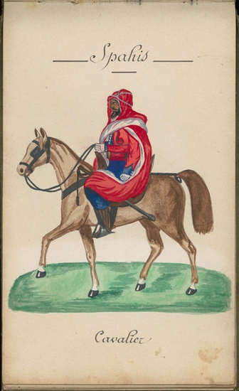 Armée Française. Wohl Frankreich, ca. 1885. 59 Uniformen, 16 Pferde und 4 Maultiere auf 41 Tafeln. Aquarelle, teils gold-, silber- und deckweißgehöht. Originaler blindgepr., illustr. Leinenband. Dreiseitiger Goldschnitt. Qu.-8vo (234:146 mm). Hübsches Aquarellalbum mit den Uniformen der französischen Armee des späten 19. Jahrhunderts, darunter 16 Tafeln von Kavallerieeinheiten, 4 von Maultieren mit Geschützen und schwerem Gepäck, sowie mehrere legendäre Kolonialeinheiten wie die Chasseurs d'Afrique, Spahis, Zouaven, Turcos und Tirailleurs Tonkinois. - Papier gleichmäßig etwas gebräunt; der Einband an Ecken und Kanten berieben und bestoßen, aber noch sehr ansprechend.