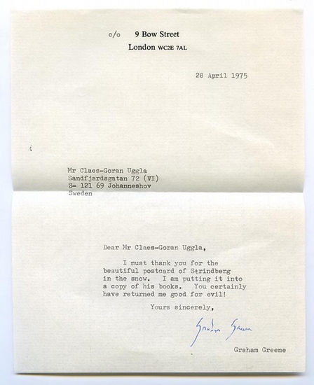Ms. Brief mit eigenh. U. London, 28. IV. 1975. 1 S. Kl.-4to. An einen Sammler: "I must thank you for the beautiful postcard of Strindberg in the snow. I am putting it into a copy of his books. You certainly have returned me good for evil! [...]". - Auf Briefpapier mit gedr. Adresse.