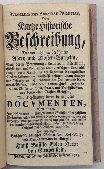 Burgelinensis Abbatiae Primitiae, Oder Kurtze historische Beschreibung der vormahligen berühmten Abtey- und Closter-Burgelin. Mit Beyfügugn derer benöthigten Documenten, Von 1138. Jena, J. A. Müller, 1729. 4 Bl., 200, 100 (recte 200) S. Moderner Pappband mit Rückenschild. Eine von wohl 3 Druckvarianten der ersten Ausgabe. Umstrittene Schrift über Abtei, Kloster, Amt u. Stadt Bürgel in Thüringen, die Hans Basilius von Gleichenstein dem Herzog Ernst August von Sachsen-Weimar widmete. Von einigen Zeitgenossen hochgepriesen (die lateinische Übersetzung wurde in Ottos "Thuringia sacra" abgedruckt), entdeckte man später, die Schrift sei "voll von dreisten Fälschungen, die lange Zeit unbesehen für wahr hingenommen worden sind" (ADB). Wenige Monate nach Erscheinen der "Beschreibung" trat Gleichenstein von seinem Posten als Hofrath u. Amtmann zurück u. siedelte nach Gotha über. - VD18 15281086; ADB XLIX, 388. - Gleichmäßig etwas gebräunt.