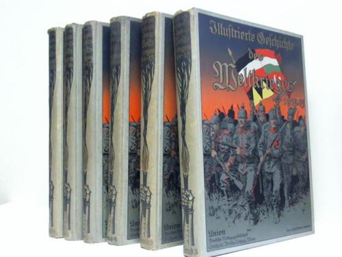 Illustrierte Geschichte des Weltkrieges 1914 - 1917. 6 Bände um, Union, Stgt., 1915. 1918). Zusammen XXIV S./2838 Seiten mit 3648 Abbildungen, 142 doppelseitigen mehrf. Kunstbeilagen, 8 großen zweifarbigen Kartenbeilagen, 223 Karten und Plänen und 6 Kriegskalender, die Ereignisse der Halbjahre enthalten, einheitliche farbig illustrierte Leinen-Einbände, Quart (gering bestoßen)---- Alles erschienene - sehr gute Exemplare - Einbandzeichnung von Anton Hoffmann, München -.