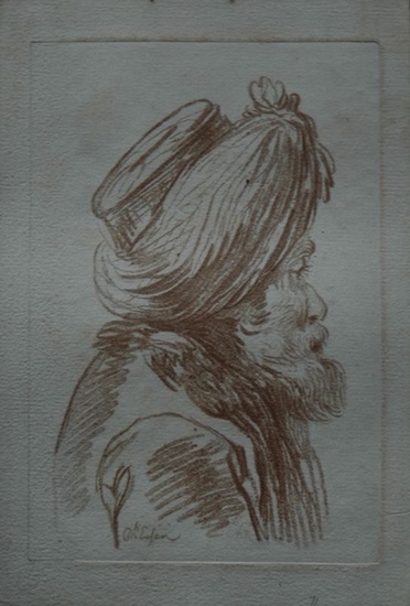 Bildnis eines bärtigen Mannes mit Turban im Profil nach rechts. Kupferstich in Crayonmanier in Braun gedruckt nach Charles Eisen. Ohne Verlegerangaben, ca. 1760. Format (Platte): 210 x 140. Blattgröße: 245 x 167 mm. *Monogrammiert in der Platte mit JCF. Jean Charles François experimentierte Zeit seines Lebens mit den unterschiedlichen Stichtechniken. 1757 gelangen ihm die ersten Versuche, Kreide- und Stiftzeichnungen im Stich genau nachzuahmen, die sogenannte Crayonmanier. Er gilt als Erfinder der Crayonmanier, welche besonders in der französischen Graphik eine bedeutende Rolle spielte. Durch dieses Verfahren ist François für die französische Grafik von besonderer Bedeutung. "Sein Verdienst besteht darin, die Punktiertechnik des Kupferstichs durch die Verbindung mit der Radiertechnik praktisch und künstlerisch leichter verwertbar gemacht zu haben" (Paul Kristeller). siehe Nagler 5, 136. - Durch dieses Verfahren sieht die vorliegende Radierung aus wie eine Lithographie. - Gut erhalten.