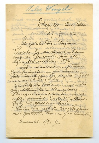 Eigenh. Brief mit U. (?Jules Wengel?). Etaples, 27. Juni 1892. 2? SS. auf Doppelblatt. Gr.-8vo. An einen namentlich nicht genannten Adressaten betr. der Aquarellausstellung 1892: ?[...] Wird man mir einen späteren Einlieferungstermin für meine Sachen bewilligen, da ich bis 15. Juli noch nicht bereit bin? ? Ich denke den Bestimmungen der Ausstellung kein allzu grosses Derangement zu bereiten, da ich infolge persönl. Einladung keine Jury zu passiren habe [...] Ich bin oft mit meinen Gedanken in unserem guten Dresden und denke zumal lebhaft an die Vorbereitungen zur Ausstellung, denen ich die beiden ersten Male beigewohnt habe und glaube sicher dass auch jetzt zum 3. male der Erfolg der Dresdner Kunstgenossenschaft sicher sein wird [...]?. ? Julius Wengel pkpk Thieme-B. ? Mit zwei zeitgen. Notizen.