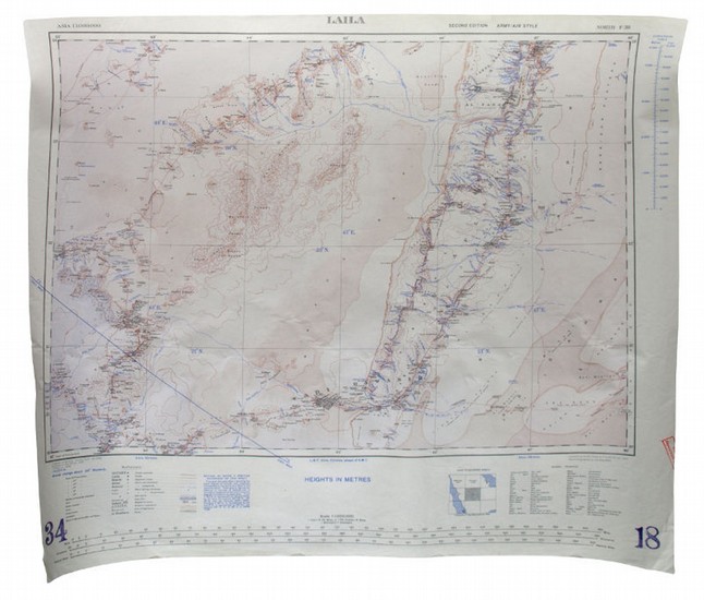 Laila. North F-38. Second edition. Army/Air Style. [London], War Office, 1944. Photolithographed map in 3 colours (70.5 x 60 cm). Scale 1:1,000,000. Rare RAF map of central Arabia, showing Jebal Tuwaiq, the desert west, and Wadi ad-Dawasir south. The first edition was published in 1925. - OCLC 634949403. Not in Al Ankary; Al-Qasimi.