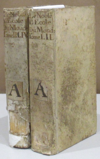 L'école du monde ou Instruction d'un père à un fils,. touchant la manière dont il faut vivre dans le monde. Divisée en entretiens. Nouvelle édition revue & corrigée. Tome premier - Tome quatrième (de 6 tomes) en 2 vols. Amsterdam, aux dépens de La Compagnie 1709. 1709. 12° 8 Bll., 174 S.; 306 S. u. 238 S.; 224 S. Jeweils mit gestochenem Frontispiz u. Titel in zweifarbigem Druck. Pergament der Zeit m. handschriftlichem Rückentitel. Die ersten vier von insgesamt 6 Bänden enthalten enthalten die ersten 16 Gespräche. - Einbände fleckig u. mit Signaturen auf Rücken u. vorderem Deckel, Rücken des zweiten Bandes mit größerer Fehlstelle, kleine Wurmspuren in Innendeckeln u. Vorsätzen, leicht fleckig, zwei Titelblätter mit Anstreichung, das erste Frontispiz im Falz eingerissen, anfangs einige Anstreichungen, 1 Bl. m. Randeinriß. Ordentliches Exemplar.