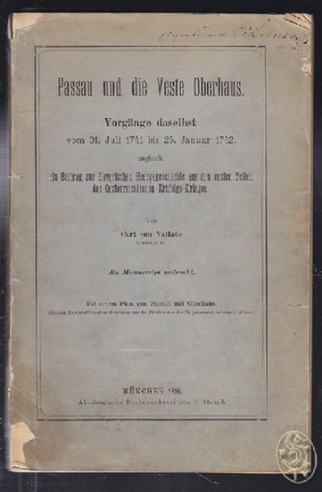 Passau und die Veste Oberhaus. Vorgänge daselbst vom 31. Juli 1741 bis 25. Januar 1742, zugleich ein Beitrag zur Bayerischen Heeresgeschichte aus den ersten Zeiten des Oesterreichischen Erbfolge-Krieges.   Mchn., Straub 1886. gr.-8°. IV S., 1 Bl., 202 S. 1 deoppelbl.-gr. Stammtaf., 1 Bl. Mit 1 mehrf. gefalt farblithogr. Karte v. Passau und Oberhaus im Massstab 1:7500. OBrosch. Einbd. beschäd. u. m. hs. Besitzvermerk. Tit. gestemp. Erste Lage gelockert. Beiliegend: Eh. Karte d. Verf. 'Bitte um freundliche Aufnahme des Buches V' sowie Waschzettel, aus dem hervorgeht, dass das Buch in nur 350 Expl. gedruckt worden ist.