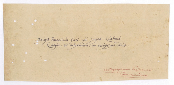 Eigenh. Albumblatt. O. O. u. D. 1 S. Qu.-12mo. Ein Stehsatz radikalen Luthertums, vom Kardinal anscheinend ironisch zitiert, um den Extremismus des Gegners bloßzustellen: "Incipit hareticus fieri, qui scripta Lutheri / Carpit, et infernum, ni resipiscat, adit" ("Wer Luther angreift, hat die Schwelle zur Häresie überschritten und muß, so er nicht Abbitte leistet, zur Hölle fahren"). Der Straßburger protestantische Theologe und Hebraist Tobias Speccer (1563-1622) zitierte das Wort (etwas ausführlicher und leicht abgewandelt) in seinem Aufsatz "De vera Iesu Christi Ecclesia & Pontificia Romana opposita" (1617) innerhalb eines akademischen Jubiläumsbands zur Hundertjahrfeier der 95 Thesen. In diesem Kontext legt der Satz Zeugnis ab von der geradezu maßlosen Verehrung, die Luther noch über sieben Jahrzehnte nach seinem Tod unter seinen Jüngern genoß. - Kardinal Commendone hatte mehrere päpstliche Missionen an die Höfe protestantischer Fürsten absolviert. Die zahlreichen Briefe, die er während seiner Mission in Deutschland während der Jahre 1560/61 schrieb, als er die katholischen und protestantischen Stände zur Teilnahme am wiedereröffneten Konzil von Trient einlud, zeichnen ein lebhaftes Bild von der Situation der deutschen Kirchen jener Zeit. - Etwas wurmspurig. Hs. Echtheitsbestätigung des 18. Jhs. ("Autographum Cardinalis Commendone") in roter Tinte am Fußende des beschnittenen Blatts.