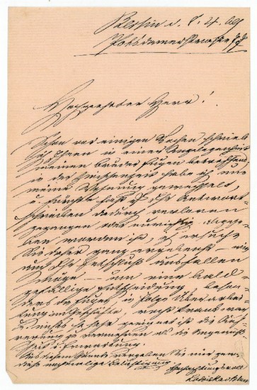 Eigenh. Brief mit U. Berlin, 8. IV. 1869. 1 S. auf Doppelblatt. Gr.-8vo. An einen namentlich nicht genannten Adressaten: "Schon vor einigen Wochen schrieb ich Ihnen in einer Angelegenheit meinen Bruder Eugen betreffend. In der Zwischenzeit habe ich nun meine Wohnung gewechselt, u. fürchte fast, daß Ihr Antwortschreiben dadurch verloren gegangen war [...]". - Die aus Polen stammende Schriftstellerin lebte von 1869 bis 1882 in Wien und war dort als Feuilletonistin bei einer Zeitung tätig, in der auch ein Teil ihrer Novellen und Essays erschien. Von 1882 an lebte sie aus Gesundheitsgründen in Venedig und veröffentlichte zahlreiche Romane, Theaterstücke, Erzählungen und Novellen. Zu ihrer Zeit war sie zudem ein "seltenes Beispiel einer weiblichen Verfasserin von Kriminalromanen" (Sophie Pataky (Hrsg.): Lexikon deutscher Frauen der Feder. Bd. 1. Berlin 1898, S. 79). Ihr in mehrere Sprachen übersetztes Werk war vor allem in Frankreich erfolgreich.
