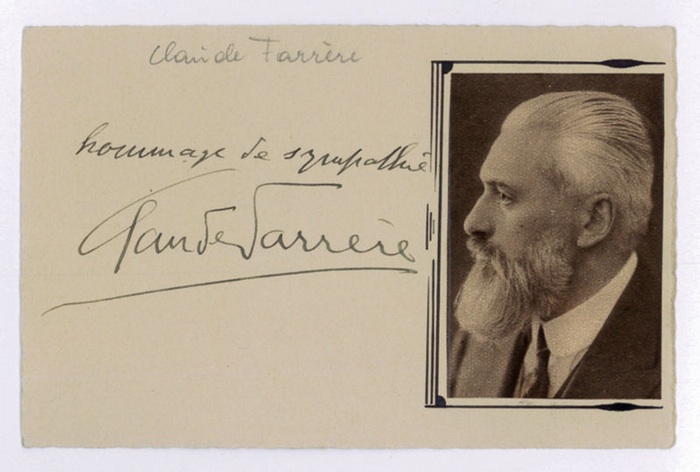 Eigenh. Albumblatt mit U. O. O., März 1931. 1 S. Qu.-8vo. "hommage de sympathie | Claude Farrère". - Mit alt montiertem Portrait (Zeitungsausschnitt).