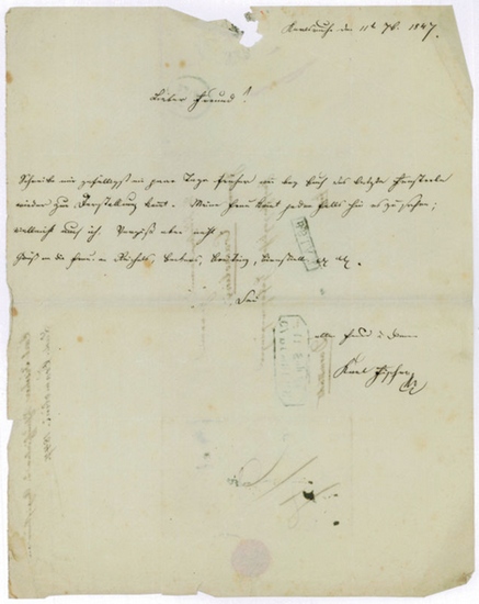 Eigenh. Brief mit U. Karlsruhe, 11. IX. 1847. ? S. 4to. Mit eh. Adresse (Faltbrief). An den Sänger Ludwig Cramolini (1804-1884) in Darmstadt: "Schreibe mir gefälligst ein paar Tage früher wenn bey Euch das letzte Fensterln [von Ignaz Lachner nach J. G. Seidl] wieder zur Darstellung kommt. Meine Frau kommt jedenfalls hin es zu sehen; vielleicht auch ich. Vergiß aber nicht [...]". - Karl Fischer war Oberregisseur des Schauspiels am Karlsruher Hoftheater. - Mit stärkeren Randläsuren und etwas fleckig.