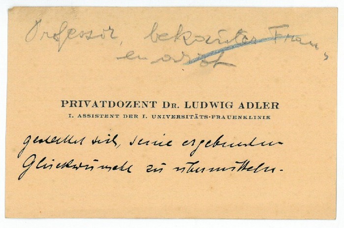 Eigenh. Visitenkarte. Wien, o. D. 70 x 110 mm. "Privatdozent Dr. Ludwig Adler I. Assistent der I. Universitäts-Frauenklinik" (dies gedruckt) "gestattet sich, seine ergebensten Glückwünsche zu übermitteln". - Ludwig Adler studierte an der Medizinischen Fakultät der Universität Wien, wo er im Jahr 1900 zum Doktor der gesamten Heilkunde promoviert wurde. Danach arbeitete er am Allgemeinen Krankenhaus der Stadt Wien und am Pathologisch-Anatomischen Institut der Universität Wien.