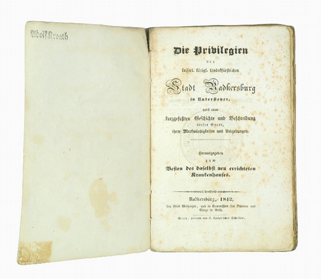 Die Privilegien der kaiserl. königl. landesfürstlichen Stadt Radkersburg in Untersteyer, nebst einer kurzgefaßten Geschichte und Beschreibung dieser Stadt, ihrer Merkwürdigkeiten und Umgebungen. Radkersburg, Alois Weitzinger, 1842. 8°. Mit einer Holzschn.-Abbildung (Titel verso) u. einem lithogr. Stadtplan. VIII, 168 S., OKart. Erstausgabe; ohne die sechs Tafeln, die diesem Handexemplar nie beigebunden waren. - Der Holzschnitt mit einer Abbildung des ältesten Stadtsiegels von 1418. - Durchschossenes (interfoliiertes) Handexemplar des Verfassers mit zahlr., tlw. umfangreichen Ergänzungen u. Anmerkungen sowie einigen Korrekturen. Titel verso mit dem mont. lithogr. Namensschildchen Hofrichters. - Umschlag berieben u. bestoßen. Unteres Kapital m. Fehlstelle. Innendeckel m. altem Namensstempel. Ecken etw. bestoßen. Gebräunt u. stockfleckig. - Schlossar 212.