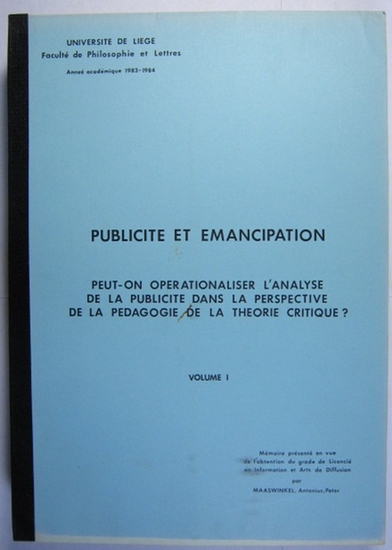 Publicite et Emancipation. Peut-on operationaliser l'analyse de la publicite dans la perspective de la pedagogie de la theorie critique. Volume I / II. [2 Bde. vollständig] Faculté de Philosophie et Lettres, Universite de Liege, 1984. 399 S., + Annexes. 4°, OKart. Diplomarbeit von Peter Antonius Maaswinkel mit eigenh. unterschriebenen, maschinenschriftlichen Brief an Diethart Kerbs. Guter Zustand.
