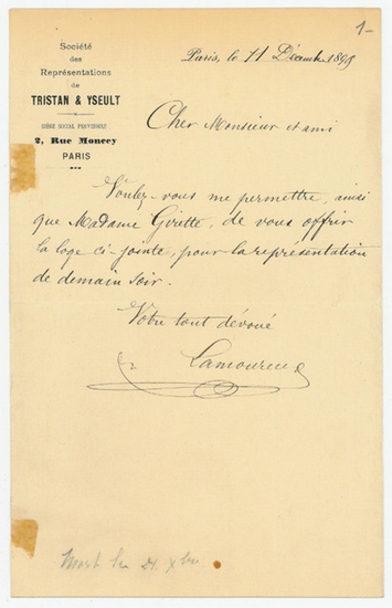 Eigenh. Brief mit U. (?Ch. Lamoureux?). Paris, 11. XII. 1899. ? S. auf Doppelblatt. Gr.-8vo. Wohl einer der letzten Briefe des Musikers, der zehn Tage darauf versterben sollte. An einen namentlich nicht genannten Adressaten mit der Bitte um einen Logenplatz für eine Madame Girette, wohl die Sängerin Emilie Girette, die später den Pianisten Edouard Risler ehelichen sollte: ?Voulez-vous me permettre, ainsi que Madame Girette, de vous offrir la loge ci-jointe, pour la représentation de demain soir [...]?. ? Durch sein Schaffen trug Charles Lamoureux dazu bei, ?in Frankreich das Verständnis für die klassische Musik zu verbreiten, setzte sich aber auch für die Werke der Zeitgenossen Saint-Saëns, Lalo, Franck, Chabrier, d?Indy und Paul Dukas ein. Seine Konzerte wurden gleichzeitig zum Mittelpunkt des Wagnerismus in Frankreich. Lamoureux war es, der am 3. Mai 1887 die erste französische ?Lohengrin?-Aufführung im Eden-Théâtre organisierte und dirigierte, ebenso 1899 die achtzehn Aufführungen von ?Tristan und Isolde? im Nouveau Théâtre [...] Lamoureux war ein großer Dirigent, dessen Aufführungen sich durch bemerkenswerte Präzision und Sicherheit auszeichneten und schlechthin vollendet waren? (MGG VIII, 148f.). ? Auf Briefpapier mit gedr. Briefkopf der ?Société des Représentations de Tristan & Yseult? (Wagners Oper sollte die letzte Aufführung sein, die der Dirigent leitete); das unbeschriebene Bl. 2 mit einem kleinen Ausriß, Bl. 1 mit alten Montagespuren und papierbedingt leicht gebräunt.