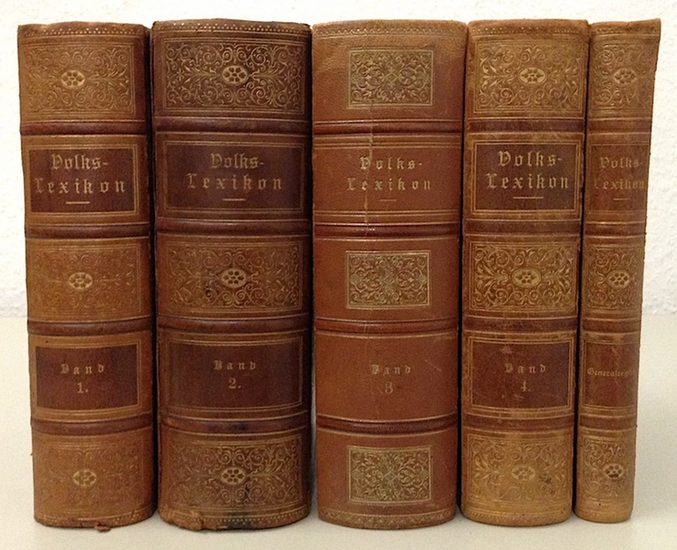 Volks-Lexikon. Nachschlagebuch für sämmtliche Wissenszweige mit besonderer Berücksichtigung der Arbeiter-Gesetzgebung, Gesundheitspflege, Handelswissenschaften, Sozial-Politik. Nebst General-Register, herausgegeben von E.Wurm. 4 Bände u. Generalregister in zus. 5 Bänden. Nürnberg, Wörlein u. Co. 1894-99. Originalhalbleder (berieben u. etwas bestoßen, Band 1-2 Gelenke sauber repariert u. Vorsätze erneuert, Vordergelenk des Registers mit langem Einriß). Berühmtes Volkslexikon aus der Arbeiterbewegung. Wörlein war bekannt für seine Publikationen zu Gewerkschaft u. SPD. Mit Beiträgen von Eduard Bernstein, Wilhelm Blos, Adolf Braun, Dr. David, Bruno Geiser, S. Katzenstein, Eleanor Marx Aveling, Max Quarck, Arthur Stadthagen und vielen anderen (s. Nachwort zu Band 4). - Gebräunt.