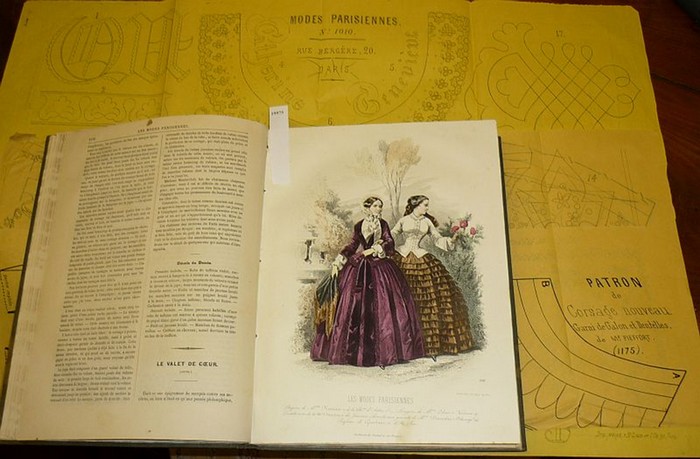 Les modes Parisiennes illustrées. Journal de la bonne Compagnie. Onzième année. No. 553, Octobre 1853- No. 566 in 1 Band. Paris, D'Aubert Successeur, 1853. 4to. Mit 1 kolor. Mode-Lithographie u. 14 kolorierten gest. Modetaf. S. (1093)-1260. Lwd. d. Zt. m. goldgeprägt. Rückentitel. Marmorschnitt. 14 Nummern (1 Vierteljahr) in vollständiger Folge in 1 Bande. - Einband berieben u. wasserfleckig. Das Innere mit den schönen Modekupfern nicht betroffen. - Beiliegend zwei mehrfach gef. Schnittmusterbögen de "Modes Parisiennes" No. 1010 u. 1175 (verknittert).