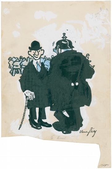 Herr Wachtmeister; entschuldigen Sie. Polizist und Herr, im Hintergrund eine Menschenansammlung. _. Tuschpinselzeichnung, Farbstift in Blau, Deckweiß, auf Karton. Signiert. Ca. 24:19 cm. Literatur: Ausst. München 1977/78, Simplicissimus ? eine satirische Zeitschrift München 1896-1944, Nr. 143, 406; Flemig, S. 24. Karikaturist, Maler, Mitarbeiter ?Jugend?, ?Simplicissimus? und ?Komet?.