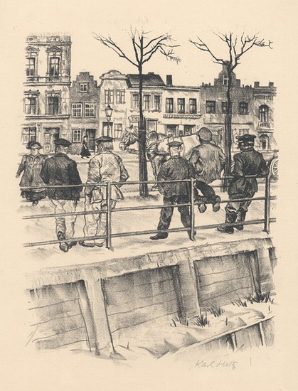 Kanalgeländer. Männer am Geländer (Danzig).   1922. Lithographie, 1922, signiert und betitelt. Darstellungsgröße ca. 29:22,5 cm, Blattgröße 38:29,8 cm. Katalog Niemann 1987, Nr. 32. ? Prachtvoller Druck auf gelblichem Bütten. Links unten etwas knitterig. Holtz studierte 1914-1919 bei E. Orlik (1870-1932) an der Berliner Kunstgewerbeschule. Anschließend war er als Pressezeichner tätig. 1934-1935 erhielt er wegen antinationalsozialistischer Karikaturen Berufsverbot. In dieser Zeit arbeitete er als Gebrauchsgraphiker.