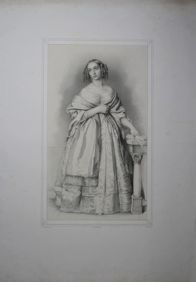 Portrait. Junge Frau als Ganzfigur in schulterfreiem langem Kleid, der linke Arm auf einen Marmortisch angelehnt. Getönte Lithographie von C. Hahn nach einer Zeichnung von Eduard Bendemann 1811-1889. München, Druck bei Hanfstaengl, ca. 1835. Format (Bildbereich): 430 x 345 mm. Blattgröße: 720 x 545 mm. *Die dargestellte junge Schönheit ist nicht bezeichnet und ließ sich von mir nicht ermitteln. - Der Porträtist Eduard Julius Friedrich Bendemann war ein deutscher Maler und ein wichtiger Vertreter der Düsseldorfer Malerschule. - Blattränder minimal gebräunt, insgesamt sehr gut erhalten.