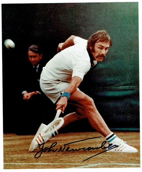 Portraitphotographie mit eigenh. Unterschrift. o. O. u. D. 250 : 200 mm. John Newcombes kraftvolles Serve- und Volleyspiel war der Garant für sein aggressives Spiel. Zur Freude der Zuschauer und zur Überraschung der Gegner schlug er auch mit dem zweiten Aufschlag ein As. Seine Spielweise machte ihn 1967 zur Nummer 1 im Amateursport. Als professioneller Spieler war er 1970, 1971 und 1974 Erster der Rangliste. Im Einzel gewann er zweimal die Australian Open, dreimal in Wimbledon und zweimal die US Open.