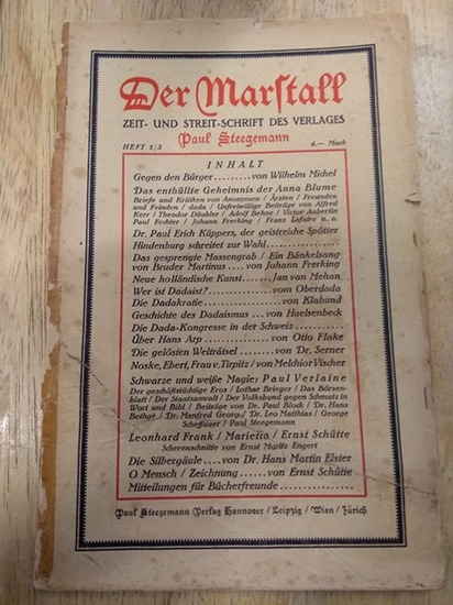 Der Marstall. Zeit- und Streitschrift des Verlages Paul Steegemann. Heft 1/2 (alles Erschienene). Hannover, Paul Steegemann Verlag, (1920). 58 S. u. 6 Anzeigenseiten, mit mehreren Illustrationen, darunter eine ganzseitige "für George Grosz" von Ernst Schütte. Original-Broschur. Papierbedingt gebräunt, ein wenig braunfleckig. Die äusseren Blätter lose, Ränder teils brüchig u. mit Randläsuren. Falz, kurzer Einriß hinten und Querriß im Deckblatt mit Tesafilm geklebt. - Originalausgabe - Meyer 35 - Raabe, Zeitschriften 91 - Die "Zeit- und Streitschrift des Verlages" enthält u.a. eine umfangreiche Sammlung von Reaktionen auf den Gedichtband "Anna Blume" von Kurt Schwitters: Briefe und Kritiken von Anonymen, Ärzten, Freunden und Feinden, darunter u.a. Alfred Kerr, Theodor Däubler, Victor Auburtin, außerdem: Wilhelm Michel "Über die Metaphysik des Bürgers", Klabund "Die Dadakratie. Eine Rezension", Richard Huelsenbeck "Aus der Geschichte des Dadaismus", Walter Serner "Die gelösten Welträtsel", Melchior Vischer "Sekunde durch Hirn", Hans Martin Elster "Die Silbergäule" - SW: DADA in Hannover, Merz - Versandkosten innerhalb Deutschlands EUR 5,00 (versicherter Versand).