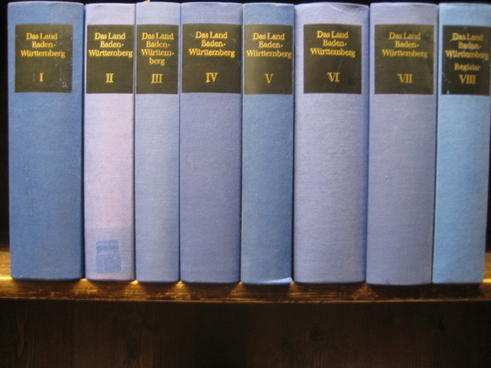 Das Land Baden-Württemberg. Amtliche Beschreibung nach Kreisen und Gemeinden. 1. A. 8 Bde. Stgt., Kohlhammer 1971-1983. Gr.8°. Original-Leinenband. Bd. 1 in 2. verb. A.; Bd. 2 Stempel auf Vorsatz, Rückenschild entfernt. Ohne die beiden Kartenmappen.