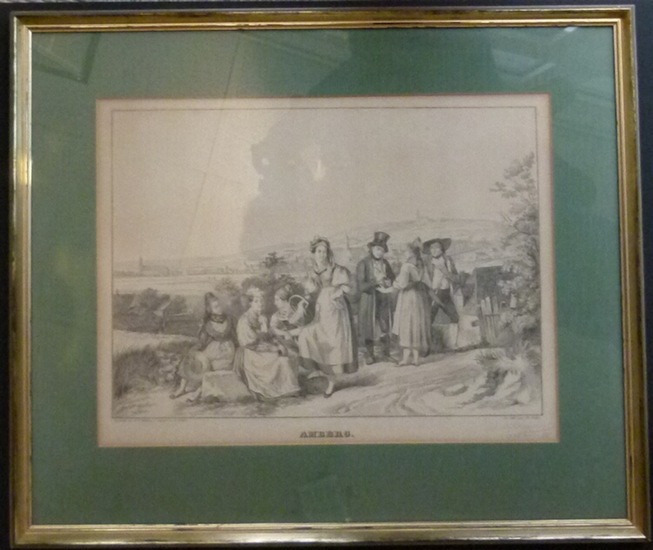 Amberg. Gesamtansicht mit sieben großen Trachtenfiguren im Vordergrund. Stahlstich von Johann Philipp Walter nach C. V. Schellhorn, "componirt von G. Perlberg", um 1840, 26, 5 x 37 cm. Ca. 26,3 x 37 cm (Darstellung ohne Schrift), ca. 45 x 54 cm (Rahmenaußenmaß). Am unteren rechten Rand alte Bleistiftanmerkung zu den Lebensdaten von Johann Philipp Walther, Blatt leicht gebräunt. Gerahmt unter leinenkaschiertem Passepartout in Echtgoldleiste. Selten!.