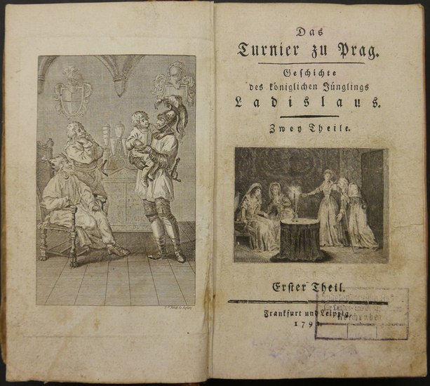 Das Turnier zu Prag. Geschichte des königlichen Jünglings Ladislaus. Zwey Theile. Frankfurt und Leipzig, 1792. Ca. 17 x 10,5 cm. Gestochenes Frontispiz, 236 Seiten, mit gestochener Titelvignette, 2 Blätter Verlagswerbung; 287 Seiten, mit gestochener Titelvignette. Halblederband der Zeit mit Farbschnitt. 2 Teile in einem Band. Erste Ausgabe. Einband berieben und bestoßen, Kapitale mit Fehlstellen, Titel und Titelrückseite mit Stempel, teils fingerfleckig. Mit starken Gebrauchsspuren.