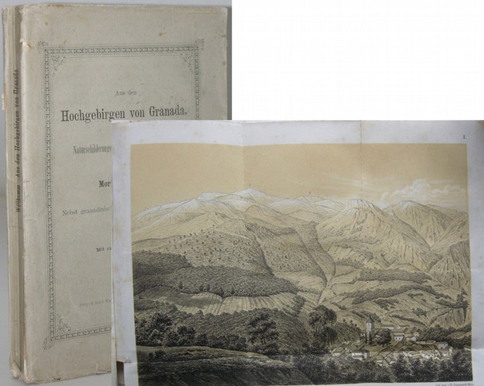 Aus den Hochgebirgen von Granada Naturschilderungen, Erlebnisse und Erinnerungen. Nebst granadinischen Volkssagen und Märchen. Mit zwei Steindrucktafeln Wien, Gerold, 1882. XVI, 414 SS., 1 Bl. Anzeigen, 2 gef. getönte Lithographien, unaufgeschnitten Orig.-Broschur, 8°. Gut erhaltenes Exemplar, Erste Ausgabe - Foulché Delbosc 407 c - Mit Ansichten aus der Sierra Nevada und Guéjar,.
