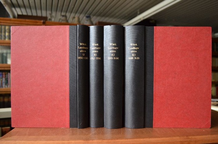 Württembergische Landtagsakten. I. Reihe Erster Band: 1498-1515; II. Reihe Erster Band 1593 - 1598; II. Reihe Zweiter Band 1599 - 1608; II. Reihe Dritter Band: 1608 - 1620. 4 Bände (alles Erschienene). Stuttgart, Kohlhammer, 1913. XLI, 311; X, 652; 844; XLVIII, 862 S. 24 x 17 cm, neueres Halbleinen. Einband berieben. Besitzerstempel auf Innendeckel. Eingebundener Broschurdeckel. Innen sauber und frisch.