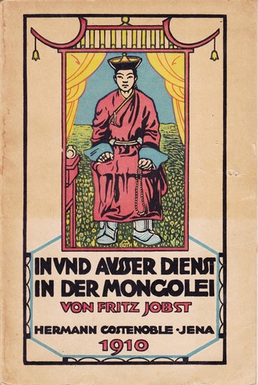 In und außer Dienst in der Mongolei. Jena,Costenoble 1910. XII,188 S. mit 88 Illustrationen und 2 Karten. Farbig illustr. Okart., Rücken mit Knickspuren, etwas nachgedunkelt u. (wasser)fleckig, Vorderumschlag mit zwei winzigen Löchern, Titelblatt sowie einige wenige weitere Seiten leicht stockfleckig, sonst gut erh.