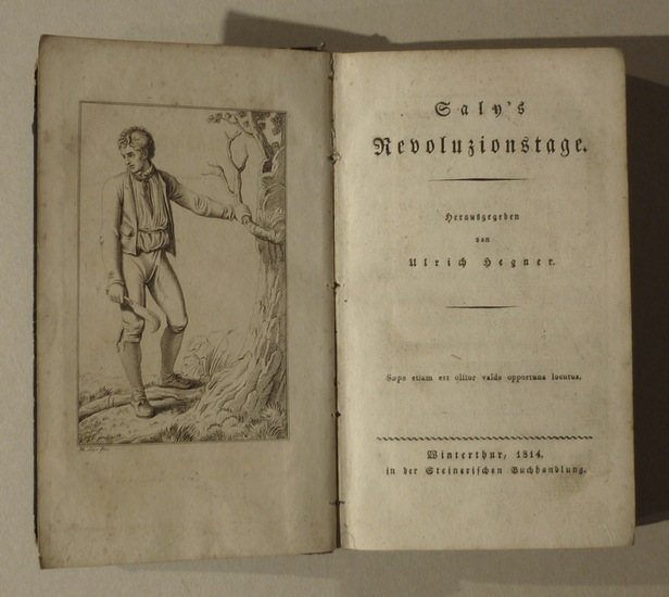 Saly's Revoluzionstage. Winterthur, Steiner, 1814. Kl.-8°. VI, 301 S. Mit gestoch. Frontispiz von Lips. Pappband der Zeit. Goedeke VI, 490, 8. - Borst 1199. - Erstausgabe. - Der Winterthurer Ulrich Hegner (1759-1840), Sohn des Stadtarztes, studierte «trotz fehlender Neigung» in Strassburg Medizin. Danach lebte er als Privatmann in Winterthur, beschäftigte sich mit Literatur und Kunst und war als Bibliothekar und Schriftsteller tätig. 1786-1798 versah er in der Grafschaft Kyburg das Landschreiberamt, das in seiner Familie erblich war. Nach 1798 übernahm er aus republikanischem Pflichtgefühl städtische und kantonale Ämter, u.a. wirkte er als Kantonsrichter, als Winterthurer Stadtrat, als Zürcher Kantonsrat und war Mitglied der Kantonsregierung. Er wurde bekannt durch seine Reiseberichte und Romane. In "Saly's Revolutionstage"schildert er in der fiktiven Autobiographie des Holzhackers Saly die geistigen Wirkungen während der beginnenden helvetischen Revolution von 1798. Er gilt als einer der namhaftesten hiesigen Vertreter des literarischen. Biedermeiers. (s. Meinrad Suter, HLS). - (Rückenschild abgesplittert. Einband stark berieben. Exlibris auf Vorsatz. Etwas fingerfleckig. Mit einigen zeitgenössischen Randnotizen in schwarzer Tinte und spätere Randnotizen in Bleistift).