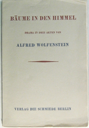 Bäume in den Himmel. Drama in drei Akten. Berlin, Die Schmiede, 1926. 101 S., 1 Bl. (Verlagsanzeigen). Gr.-8°, Orig.-Broschur. Erste Ausgabe. - Wolfenstein war als Dramatiker wenig Glück beschert. Er schrieb Stücke in stark expressionistischem Stil, die selten oder gar nicht aufgeführt werden. Das vorliegende Werk ist eine der drei Ausnahmen, so wurde es 1928 in Oberhausen das erste Mal aufgeführt. Aber auch die Aufführungen seiner Stücke blieben ohne Erfolg. Kritiker bemängelten die Künstlichkeit der Handlung, die schwache Aussage und den belehrenden Duktus. (Vgl. Spring (Hrsg.): Alfred Wolfenstein: Lesebuch.) - Broschur leicht angeschmutzt u. etwas knickspurig. - Raabe/Hannich-B. 335.13. - Hermann/Schmitz B 186.