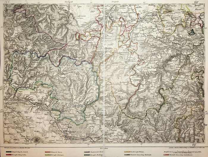 SCHLEUSINGEN (=BLATT Nr.: 164; G. D. Reymann's topographische Special-Karte von Central-Europa = G. D. Reymann's topographische Special-Karte von Deutschland, Schweiz, Ostfrankreich, Belgien, Niederlande, u. Polen Masstab 1:200000) Glogau, Verlag Carl Flemming, ca. 1831. Landkarte, Stahlstichkarte mit Grenzkolorit, Format: ca. 26 x35,5 cm, in 2 Segmenten auf Leinen gezogen; Entworfen u. gezeichnet von Fils 1828. Gestochen Situation, Schrift und Berge von J. C. Richter im 72 ten Jahre, 1831. Zustand: gut +. G. D. Reymann's topographische Special-Karte von Central-Europa = G. D. Reymann's topographische Special-Karte von Deutschland, Schweiz, Ostfrankreich, Belgien, Niederlande, u. Polen Masstab Ma?stab Massstab 1:200000, Spezialkarte, Spezial-Karte, Special-Karte, Specialkarte, 1:200 000, 1:200 000, Stahlstich, Landkarte, Begr?ndet von Daniel Gottlob REYMANN (1759-1837 ) weitergef?hrt von Karl Wilhelm von OESFELD(1781-1843) sp?ter von Friedrich HANDTKE (1815-1879).