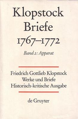 Friedrich Gottlieb Klopstock: Werke und Briefe. Abteilung V 2: Briefe 1767-1772. Band 2: Apparat / Kommentar / Anhang Berlin, De Gruyter, 1992. 1. Aufl. Leinen 1160 S. gr. 8°. leichte Gebrauchsspuren Sofortversand mit Rechnung, schönes, sauberes Exemplar, äußerlich leichte Lagerspuren und ein kleiner Archivstempel auf dem Vorsatzblatt.