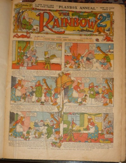 The Rainbow 2d. Playbox Annual. Vol. 17. No. 829, January 4th 1930 - No. 880, December 27th 1930. - Teile des Jahrgangs in 1 Band.   London, The Amalgamated Press, 1930. Folio. Durchgehend illustriert mit je mehrfarbiger Titelseite, 3 Seiten in Rot u. Schwarz, sonst s/w. Einzeln paginiert, je 12 S. Hldr. d.Zt. m. goldgeprägt. Rückentitel. Unvollständige Zusammenbindung zahlreicher Hefte des Jahrgangs. 31 Hefte vollständig mit 12 Seiten vorhanden, gelegentlich die Seiten in falscher Reihenfolge eingebunden. Dazu 4 unvollständige Hefte sowie mehrfach in der Paginierung der Hefte doppelt auftretende Seiten mit anderem Inhalt (hier der Vermerk "every wednesday" statt "every monday" auf dem Hauptteilte). - Frühes "Comic"-Magazin mit einem Großteil Bildergeschichten, aber auch Textbeiträgen. - Einband berieben. Papierbedingt gebräunt. Zahlreiche Randeinrisse, gelegentlich bis auf die halbe Seite gehend, wenige s/w-Zeichnungen sorgfältig koloriert, sonst sauber u. ordentlich.