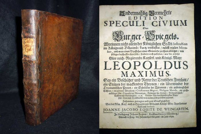 Andermahlig-Vermehrte Edition speculi civium Oder Burger-Spiegels. Worinnen nicht allein der Königlichen Städt-Instruction im Königreich Böhaimb, kurtz verfaster, nebst vielen Moralien, und was einen Vorsteher einer Gemeinde zu thun oblieget, wie selbiger beschaffen seyn solle, sondern auch zufinden, wie die anjetzo Glorreich-Regierende Kayserl. und Königl. May: Leoplodus Maximus [...] Welcher Allerdurchleuchtigsten Majestät, Treu und Dienstbarkeit von männiglich zu leisten geziemet [...]. Prag, Johann Carl Gerzabek für Johann Zieger in Nürnberg 1690. [4] Bll., 202 S., [5] Bll. - Angeb.: Ders. Prodromus redivivus speculi judicum, seu trifolium per quod judicibus justitia, prudentia, et concordia, simulque devotio et fidelitas erga Augustissimam domum Austriacam recommendatur. Ebenda 1690. [25] Bll. Restaur. Lederband d.Zt. Mit Rückenschild. Innen durchgehend leicht gebräunt, jedoch fleckenfrei. "VD 17, 1:015967Y bzw. 17, 23:306519S; Voit 983; Wurzbach 37,54. - Zwei Werke des bedeutenden böhmischen Rechtsgelehrten J.J. von Weingarten (1629-1701). Der nach seinem ""Fürstenspiegel"" veröffentlichte ""Bürgerspiegel"", zunächst 1675 erschienen, hier in erweiterter und endgültiger Ausgabe; beigebunden - wie meist der ""Richterspiegel"", erstmals 1682 gedruckt.".