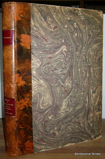 Índice de bibliografía hípica española y portuguesa. Libros, escritos ó tratados de equitacíon, jineta, brida, albeitería, etc. Madrid, Rivabeneyra, 1916-1921. 1 Bl., V, 441 S. Mit zahlreichen Abbildungen. Fol. (39,5 x 28 cm). Halbleder der Zeit mit 2 Rückenschildern (der Original-Umschlag eingebunden). Originaldruck. - Großzügig gedruckte Bibliographie spanischer und portugiesischer Pferdebücher (565 Nummern), mit teils ausführlichen Beitexten und ergänzendem Material im Anhang. - Gering gebräunt, Ecken leicht bestoßen und mit Knitterspuren. Einband etwas berieben und gering bestoßen. Schönes Exemplar.