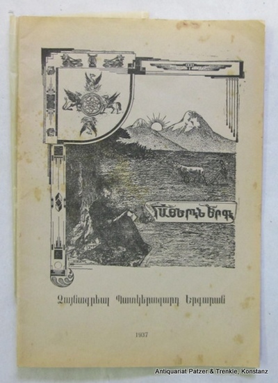 Hayeren Erge Antilias (Libanon), Tparan Dprevanuts, 1937. 24 : 17 cm. Mit Noten, Komponistenporträts u. Buchschmuck. Text durchgängig in Armenisch (printed entirely in Armenian). 46 S., 1 Bl. Illustr. Orig.-Umschlag. ("Komitas" matenashar t'iw 2). 41 Lieder armenischer Komponisten mit Noten, teils auch mit biographischen Angaben und Porträts; von uns über KVK und Worldcat nicht nachweisbar (4/2018). - Music scores and lyrics of 41 songs composed by Armenian composers (some of them with short biographical notes). Very rare. - Papier stärker gebräunt, sonst gut erhalten. Paper browned, otherwise in good condition.