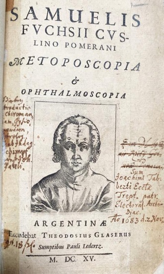 Metoposcopia & ophthalmoscopia. Mit 24 Kupfer- und 2 Holzschnitt-Porträts. Straßburg, Theodosius Glaser für Paul Ledertz, 1615. 8 Bll., 140 Seiten. Kl.-8°. (Mod.) Halbleder mit Rückentitel. Erste Ausgabe eines der frühesten Werke über die Semiologie des Auges. - VD17 23:294709Q. - Wellcome I, 2468. - Caillet 4248: "Livre recherché et rare". - Graesse, Bibl. mag.-pneum. 104. - Rosenthal 953. - Gebräunt, mit zahlr. Annotationen von alter Hand, Bl. 2 gestempelt. Schr-Ol.