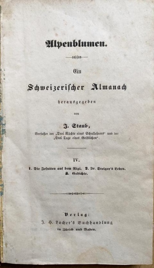 Erstdruck der Gedichte "Waldesrauschen, Denker und Dichter, Die Spinnerin, Herbst" in: Alpenblumen. Ein Schweizer Almanach, hrsg. von J. Staub. Bd. IV: Die Jesuiten auf dem Rigi. Dr. Steiger`s Leben. Gedichte. Zürich, Locher, 1846. 2 Bll., 188 Seiten. Original Pappband mit Deckeltitel (etwas fleckig, stärker beschabt). Erstveröffentlihung der frühen Gedichte. - Morgenthaler 14, 9-16 - Nicht bei W.G. - Außer "Herbst" nicht bei Zeno.org. - Etwas gebräunt bzw. leicht fleckig, 2. Hälfte wasserrandig, S. 77-109 im Innenbug wurmlöchrig. Ha-B2-21.