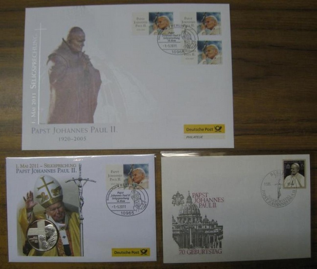 Medaillenbrief und Philatelie - Brief zur Seligsprechung Papst Johannes Pauls II. im Jahre 2011. - Beigabe: Briefumschlag zum 70. Geburtstag im Mai 1990. Weiden, Deutsche Post, 2011. Etwa 15 x 21 cm / 11,5 x 16 cm. Der Philateliebrief besteht aus einem Doppelblatt aus Karton, darin enthalten sind 6 Briefmarken und der Ersttagsstempel, mit begleitenden Texten und farbigen Fotos. Der dazugehörige originale Briefumschlag trägt 3 Briefmarken und einen Stempel. - Der Medaillenbrief ist noch in eine Klarsichthülle eingeschweißt und enthält eine Silbermedaille mit 34 mm Durchmesser sowie Postwertzeichen. Der Umschlag zum 70. Geburtstag des Papstes trägt eine Briefmarke im Wert von 35 Pfennig der DDR und einen Stempel. Alle Teile sind in sehr gutem Zustand. K00945-420267.