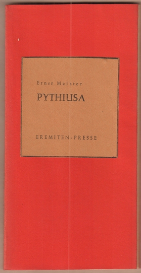 Pythiusa. Stierstadt im Taunus, Eremiten-Presse, 1958. 28 Seiten. 20 x 10 cm, Englische Broschur. Die Gedichte entstanden von Mitte Oktober bis Mitte November 1957 auf Ibiza. Leichte äußere Gebrauchsspuren, Namenseintrag auf Titel: Horst Bingel (1933-2008, deutscher Schriftsteller). Guter Zustand.
