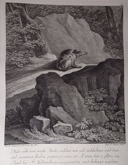 "Dieser sehr rare weiße Dachs, welcher mit gelb röthlichten und dunckel castanien flecken gespringet war, ist Ao 1724 den 5. 9bris im Parck bey St. Hubertsburg ausgegraben und behaezt worden. " Aus der zweiten, erst posthum abgeschlossenen Folge "Genaue und richtige Vorstellung der wundersamsten Hirschen sowohl als anderer besonderlicher Thiere" von Johann Elias Ridinger, Bl. 74, gestochen von seinem Sohn Martin Elias Ridinger (1731-1780). Nur eines von zwei Ridinger-Motiven aus Sachsen, gefertigt anlässlich des Endes des Siebenjährigen Krieges. Gemeint ist die Hubertusburg. Augsburg o.J. (1763). Original-Druck der Zeit. Kupferstich auf schwerem Büttenpapier, in der Platte signiert "Joh. El. Ridinger inv del et exc. Aug. Vind" sowie "Mart. El. Ridinger sculpsit." Schöner gradiger Abdruck, tiefe Schwärze. Format: Blatt 48,8 x 33,8 cm; Platte 35 x 26 cm; Darstellung 27,8 x 23,7 cm. -- Zustand: Papier leicht gebräunt und etwas fleckig, rechts oben minimaler Einriss, am linken Rand mit kleinem Wurmloch. Werkverzeichnis Thienemann 316. -- Über Johann Elias Ridinger (Quelle: wikipedia): Johann Elias Ridinger (* 15. Februar 1698 in Ulm; gest. 10. April 1767 in Augsburg) war ein deutscher Tiermaler, Kupferstecher, Radierer und Verleger. Leben: Ridinger wurde als Sohn eines zeichnerisch begabten Vaters von Christoph Rasch (auch Resch) in Ulm und Johann Falch (auch Falk) in Augsburg unterrichtet und bildete sich dann in Regensburg weiter, wo ihn seine Vorliebe für die Jagd zum Studium des Wildes am Hof des Grafen Metternich hinführte. Nach 1717 unternahm er weitere Studien in der reichsstädtischen Akademie des Georg Philipp Rugendas. Er gründete später in Augsburg einen eigenen Kunstverlag, in dem die meisten seiner Werke erschienen. 1759 wurde er Direktor der Kunstakademie. Ridinger starb am 10. April 1767 in Augsburg. Sein Werk wurde von seinen Söhnen Martin Elias (1730-1780) und Johann Jakob (1735-1784) weitergeführt. Der Verlag wurde später von der Martin Engelbrechtschen Kunsthandlung übernommen und 1827 von Johann Alois Schlosser. Werk: Seine radierten Blätter, die sich auf etwa 1600 Stück belaufen, stellen die Tiere in charakteristischen Lebensmomenten und landschaftlichen Umgebungen dar. Alte Abdrucke der Blätter sind selten. Eine Ausgabe als "Galerie Ridingerscher Tier- und Jagdstücke" wurde 1817 in Augsburg begonnen. Sehr zahlreich sind seine mit Genauigkeit und Geschmack ausgeführten Zeichnungen. -- Auswahl seiner Kupferstichfolgen: Neue Reitkunst in Kupferstichen inventiert & gezeichnet, Augsburg 1722, 22 Blatt // Betrachtung der wilden Thiere, mit beygefügter vortrefflichen Poesie des hochberühmten Herrn Barthold Heinrich Brockes, Aug. Vindelic. 1736 // Entwurff einiger Thiere, wie solche nach ihren unterschiedenen Arten, Actionen und Leidenschafften, nach dem Leben gezeichnet, samt beygefügten Anmerckungen, Teil 1 (1738), Teil 2 (1738), Teil 3 (1738), Teil 4 (1740), Teil 5 (1740), Teil 6 (Entwurf einiger Pferde, nach ihrem unterschiedlichen Alter und Gebrauch nach dem Leben gezeichnet, 1746), Teil 7 (Entwurff einiger Maul-Thiere und Esel, nach ihren unterschiedlichen Arten und Gebrauche nach dem Leben gezeichnet, 1754), 90 Blatt // Abbildung der jagtbaren Thiere mit derselben angefügten Fährten und Spuhren, Wandel, Gänge, Absprünge, Wendungen, Widergängen, Flucht, und anderer Zeichen mehr mit vielem Fleiss, Zeit und Mühe nach der Natur gezeichnet, samt einer Erklärung darüber, Augsburg 1740 // Die Parforcejagd des Hirschen, 16 Blatt // Vorstellung und Beschreibung derer Schul- und Campagne Pferden nach ihren Lectionen, 1760, 46 Blatt // Genaue und richtige Vorstellung der wundersamste Hirsche sowohl als anderer besonder Thiere, welche von großen Herren selbst gejagd, geschoßen, lebendig gefangen oder gehalten worden, Augsburg 1768, 100 Blatt.
